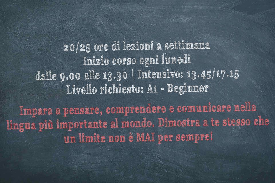 E' il corso più diffuso e prevede l’insegnamento e il miglioramento delle abilità grammaticali di base, comprensione, vocabolario, pronuncia e struttura della lingua oltre ad espressioni e colloquialismi dell’inglese di tutti i giorni. Questa tipologia di corso ha l’ obiettivo di migliorare in maniera progressiva l’abilità espositiva, la capacità di comprensione orale della lingua e la pronuncia; quindi di trasmettere a tutti gli studenti le conoscenze di base dell’inglese mettendo loro in condizione di comunicare con efficacia in inglese in una varietà di situazioni reali. Il corso standard (20 lezioni a settimana) può essere frequentato dal livello principiante a quello avanzato e si basa sull’apprendimento dei fondamentali della lingua: la forma scritta (comprensione e produzione) e quella orale (comprensione ed espressione), mentre il corso intensivo (30 lezioni alla settimana), che prevede anche un rientro pomeridiano oltre ad un ristretto numero di partecipanti, è progettato appositamente per chi desidera ottenere progressi linguistici in maniera più rapida possibile.