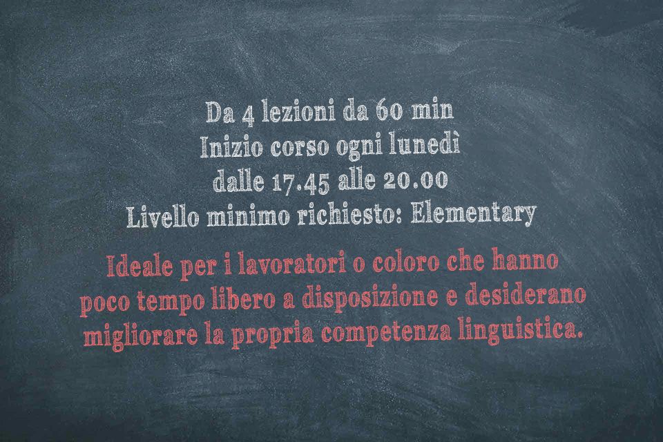 I corsi d’inglese serali, disponibili ad un prezzo accessibile, ad orari comodi e flessibili, per ogni livello di partenza e singola esigenza e tenuti da docenti specializzati, possono essere la soluzione per tutti coloro che desiderano migliorare il proprio inglese per motivi di lavoro o personali, per poter far pratica nella conversazione e raggiungere risultati concreti, immediati e misurabili.