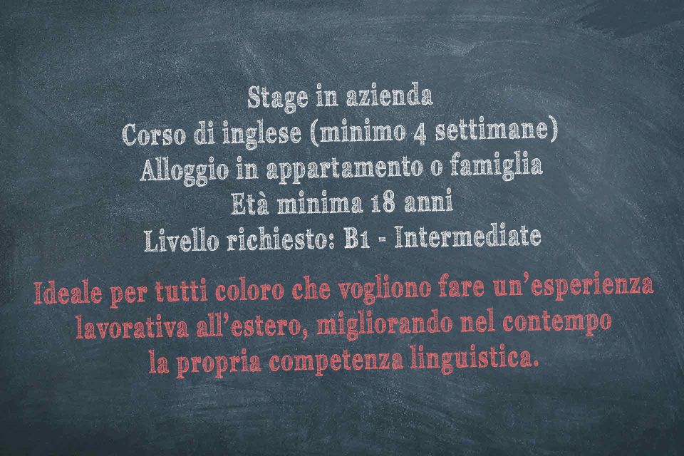 Vuoi rendere il tuo CV più competitivo, intreprendere un percorso lavorativo all'estero e nel contempo migliorare il tuo inglese? Scopri il nostro programma di studio e lavoro in UK, che unisce un corso di inglese ad una esperienza lavorativa in una delle nostre aziende partner, in un’area di tuo interesse. Negli ultimi anni, infatti, è aumentata la richiesta di giovani che desiderano e sentono la necessità di fare un’esperienza professionale o lavorativa all’estero. Per soddisfare queste esigenze ci occupiamo di favorire la ricerca di uno stage professionalizzante presso aziende ed enti privati, abbinati ad un corso di inglese obbligatorio o che permetta alla risorsa di raggiungere un livello linguistico in linea con le esigenze aziendali. Tale esperienza, seppur non retribuita, rappresenta un’opportunità eccellente per migliorare le proprie competenze linguistiche e lavorative, un ottimo mezzo per farsi le ossa, un’occasione per chi vuole cominciare a muoversi in un contesto internazionale, aprirsi a nuove prospettive e per essere più competitivi nel mondo lavorativo sia in ambito internazionale che nel proprio paese di origine.